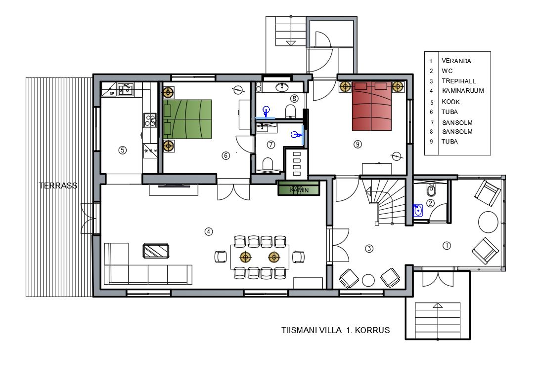 Tiismani Villa is a newly renovated manor house with a long history. The house has five bedrooms, each with two beds and a private toilet and shower. One of the rooms also features a luxurious bathtub.
